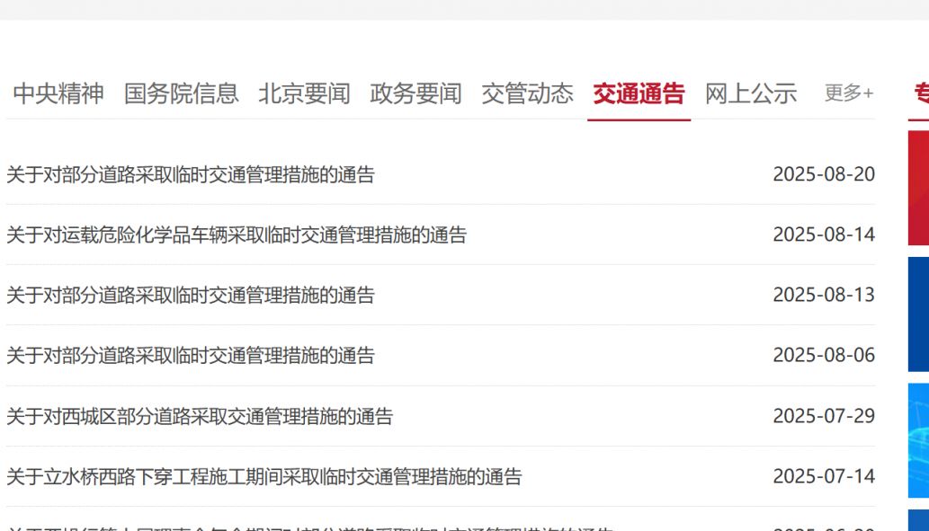 2025年10月1日0时至10月8日24时,天安门广场东侧路、天安门广场西侧路采取禁止车辆通行(持专项活动通行证的机动车除外)的临时交通管理措施,过往车辆(含公共电、汽车)可绕行周边道路。
