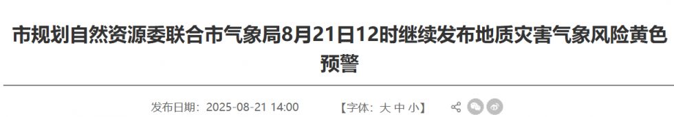 市规划自然资源委联合市气象局8月21日12时继续发布地质灾害气象风险黄色预警,8月21日14时至8月22日14时,我市昌平北部、延庆北部和南部、怀柔中部、密云西部和东南部、平谷北部发生崩塌、滑坡、泥石流等地质灾害的风险较高(黄色预警);房山、门头沟、石景山、海淀、丰台、延庆、怀柔、密云、平谷大部、昌平东北部和西部发生崩塌、滑坡、泥石流等地质灾害的风险(蓝色预警),请注意防范。