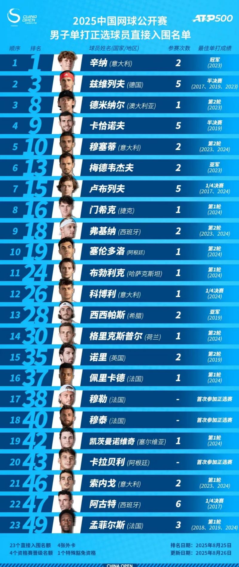 2025北京中网公开赛男子入围名单(附中网赛程安排)