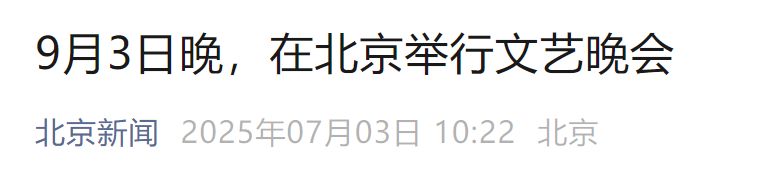 文艺晚会最新进展:定于9月3日晚,在人民大会堂举办纪念中国人民抗日战争暨世界反法西斯战争胜利80周年文艺晚会。届时,党和国家领导同志,抗战老战士、老同志,获得功勋荣誉表彰的代表,基层群众代表等各界人士将出席观看。