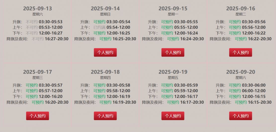 可预约日期每日中午12时更新。个人和旅游团参观天安门广场均可提前1-7日预约,旅游团须至少提前1天预约和备案(不超过前一个自然日的24时)。预约成功后,游客需在所预约时段从地区入口核验进入天安门广场参观。