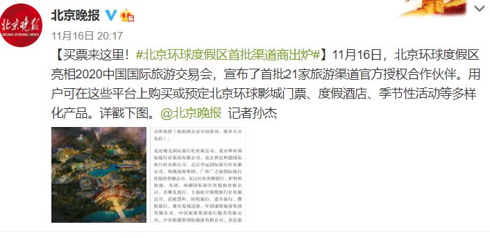 11月16日,北京环球度假区在2020中国国际旅游交易会上宣布了首批21家旅游渠道官方授权合作伙伴。今后,人们将可以在这些平台上购买或预定北京环球影城门票、度假酒店、季节性活动等多样化产品。