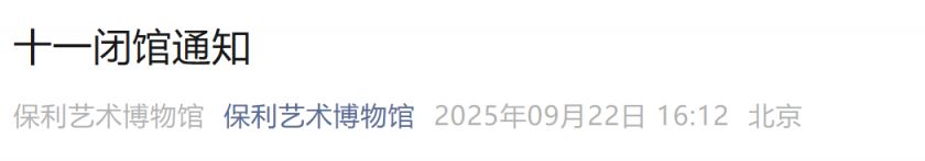 根据国家2025年全年公休假放假安排及上级单位通知,保利艺术博物馆将于2025年9月28日(周日)开放,2025年10月1日至10月8日闭馆,2025年10月9日起恢复正常开放。