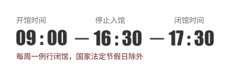 本馆每日9:00—17:00(16:00停止入馆),周一闭馆(法定节假日除外)。观众需求高峰期6月1日至10月31日延长开放至17:30(16:30停止入馆)。