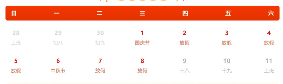 10月1日(星期三)至10月8日(星期三) 放假,共8天。期间,暂停对外提供受理、发放出入境证件服务。