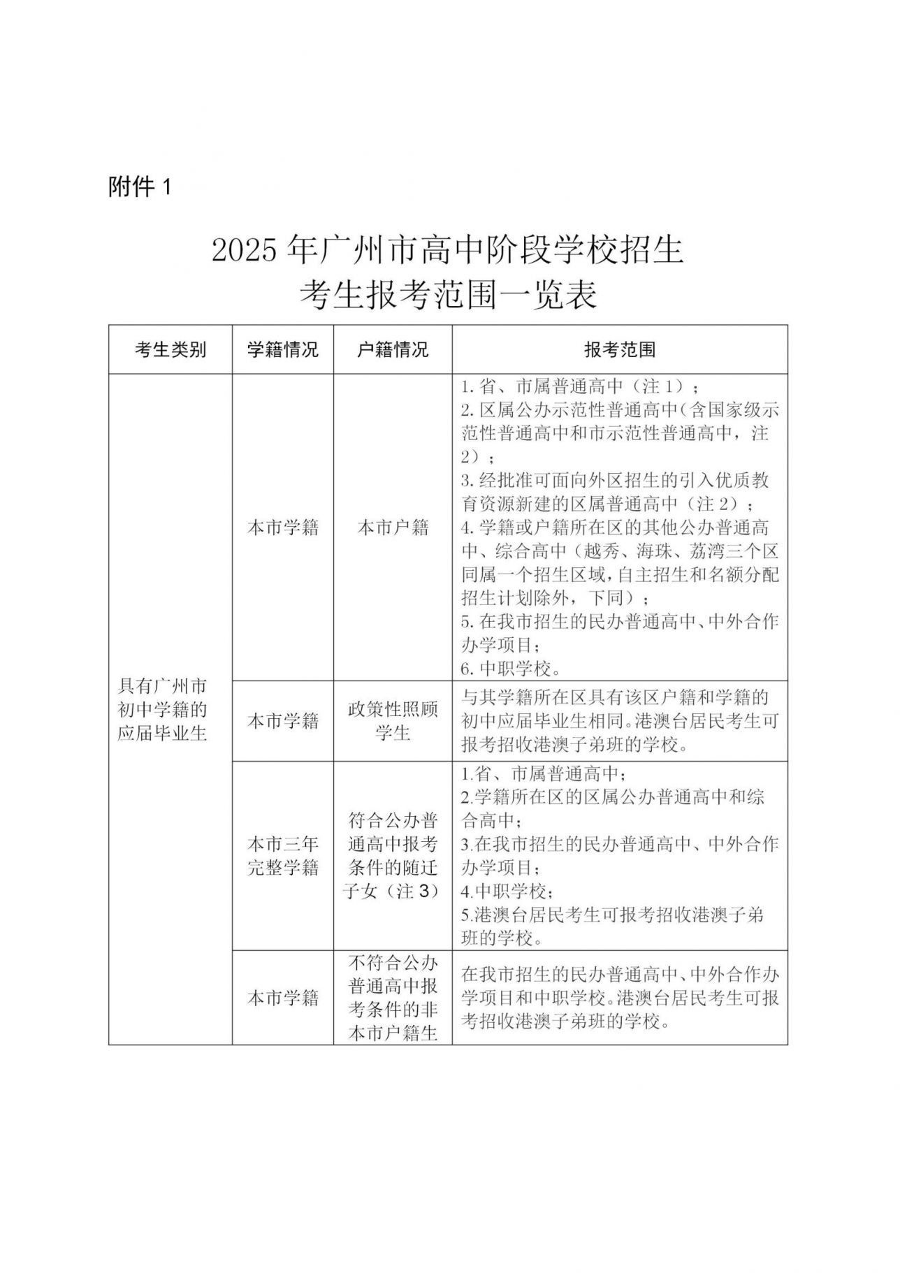 各类中考考生升学报考范围。