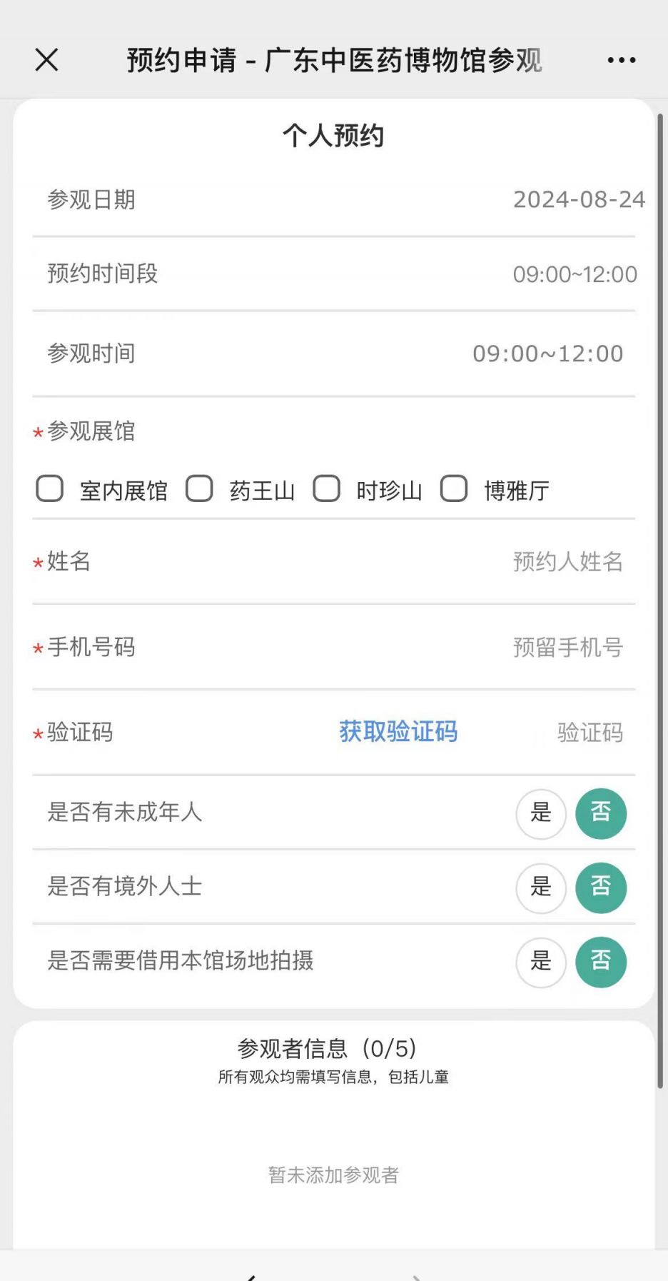依次填写预约信息(所有观众均需实名预约,包括儿童,未成年人需有成年人陪伴才能参观)。提交完成后,等待管理员审核。