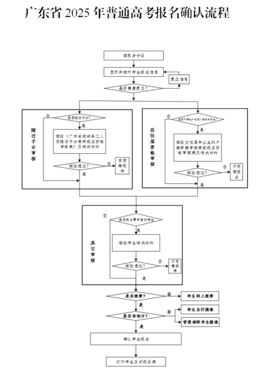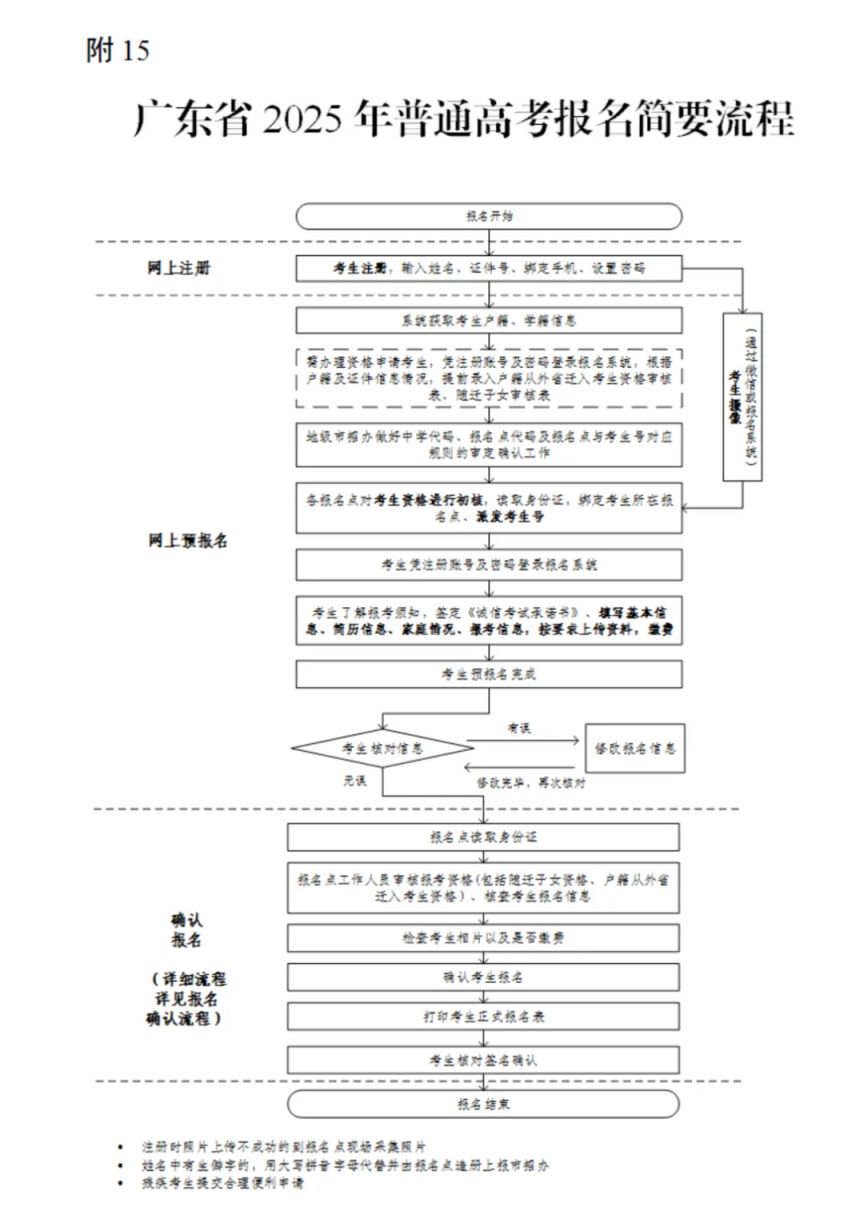 4.确认报名。网上报名完成后,考生还须在规定时间内持二代(或三代)身份证、户口簿、学籍学历等证明材料到市县招生办公室指定的报名点办理确认报名手续。确认报名手续包括确认报名资格、校对和核准报考信息等。具体报名办法按《广东省2025年普通高校招生统一考试报名实施细则》(见附4)进行。