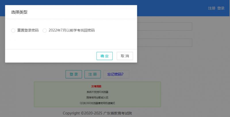 2022 年 7 月份以后未注册过的考生,登录报名系统考生端,选 “忘记密码”—“2022 年 7月以前学考找回密码”,凭手机短信验证码进行密码找回。