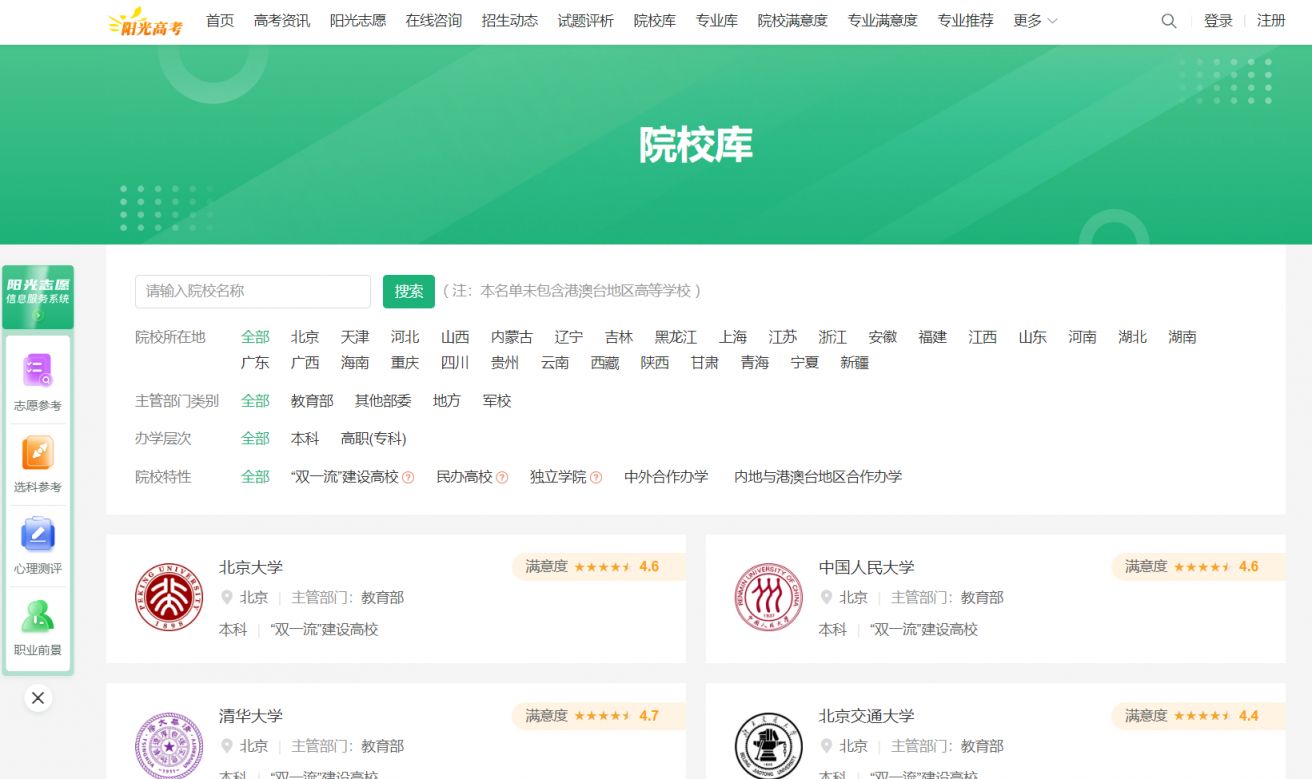 阳光高考信息平台,是教育部高校招生阳光工程指定平台。该平台集招生公示、院校信息、在线咨询、招生计划、高考动态、志愿参考等内容为考生和家长提供全方位的网上招生信息咨询服务。