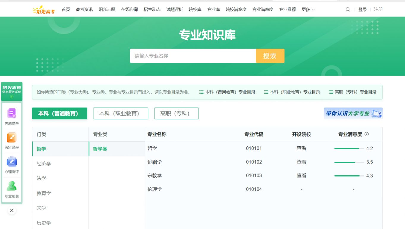 专业查询板块包括普通本科、职业教育本科和高职(专科)的专业库,其中,普通本科专业目录提供了详尽的专业介绍,包括专业简介、开设院校、开设课程、专业解读、毕业生规模统计、相近专业、考研方向、就业方向、薪酬指数等,是帮助考生了解专业的平台。
