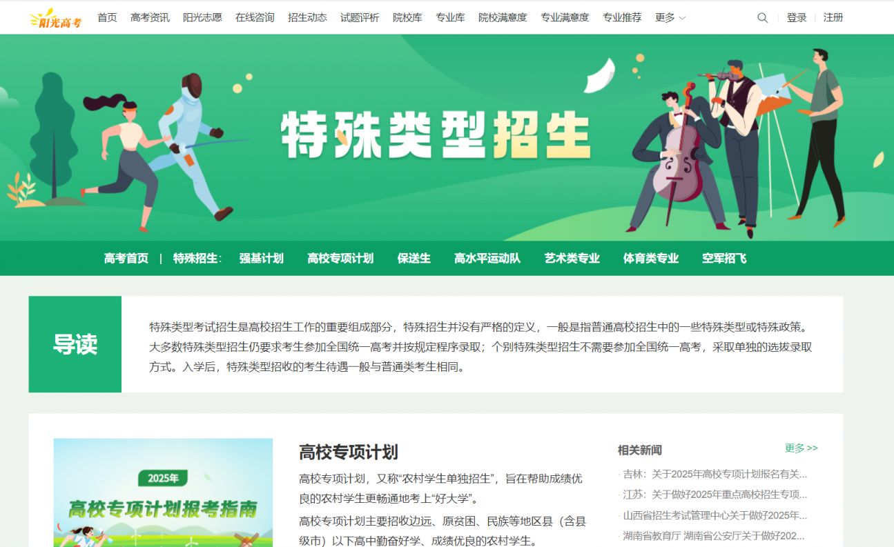 “特殊类型招生专题汇总”板块涵盖强基计划、高校专项计划、保送生、高水平运动队、艺术类专业、体育类专业、港澳高校内地招生等报考专题,还发布空军招飞、海军招飞、民航招飞、公费师范生、免费医学生等招生政策。此外,阳光高考信息平台还有特殊类考生名单公示、选科指导、心理测评、职业前景、高考志愿填报指导等内容,满足不同类型考生了解政策、大学专业、职业等各方面的信息。
