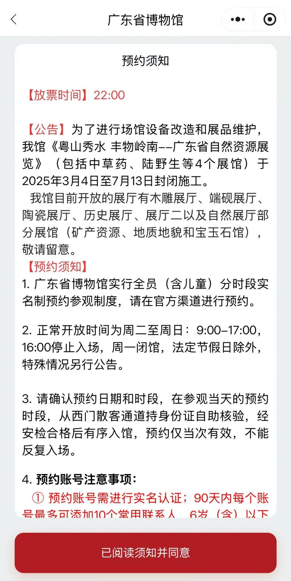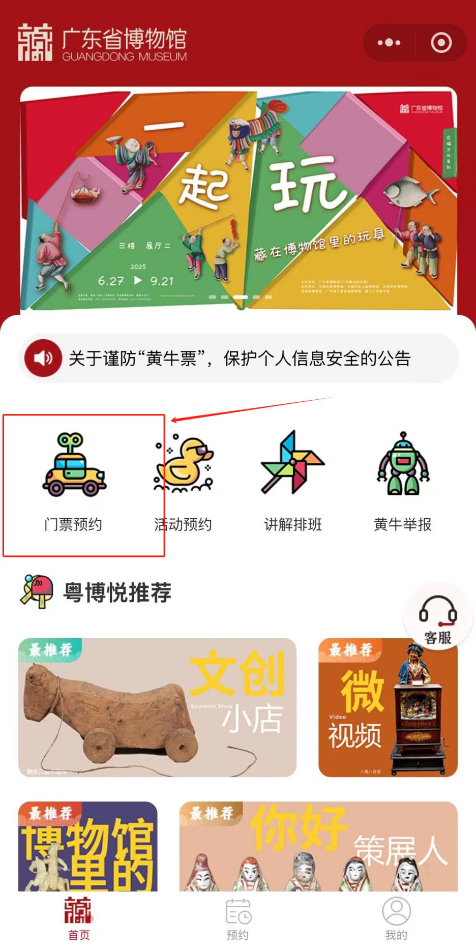 1.请认准官方预约票务渠道,拒绝购买“黄牛票”,保护个人隐私数据,谨防诈骗。免费参观门票可通过广东省博物馆官方小程序、“文化广东”APP或小程序、粤省事文旅专区预约。特展门票可以通过“广东省博物馆预约”官方小程序购买;