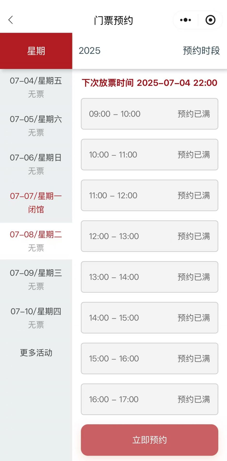 2. 博物馆放票时间为22:00,观众最多可提前7天预约门票。例如,7月30日的门票,从7月23日起,可每晚22:00进行预约;