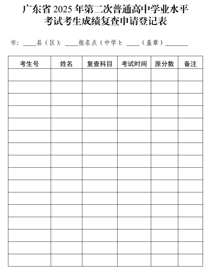 2、填写《2025年第二次广东省普通高中学业水平合格性考试考生成绩复查申请登记表》