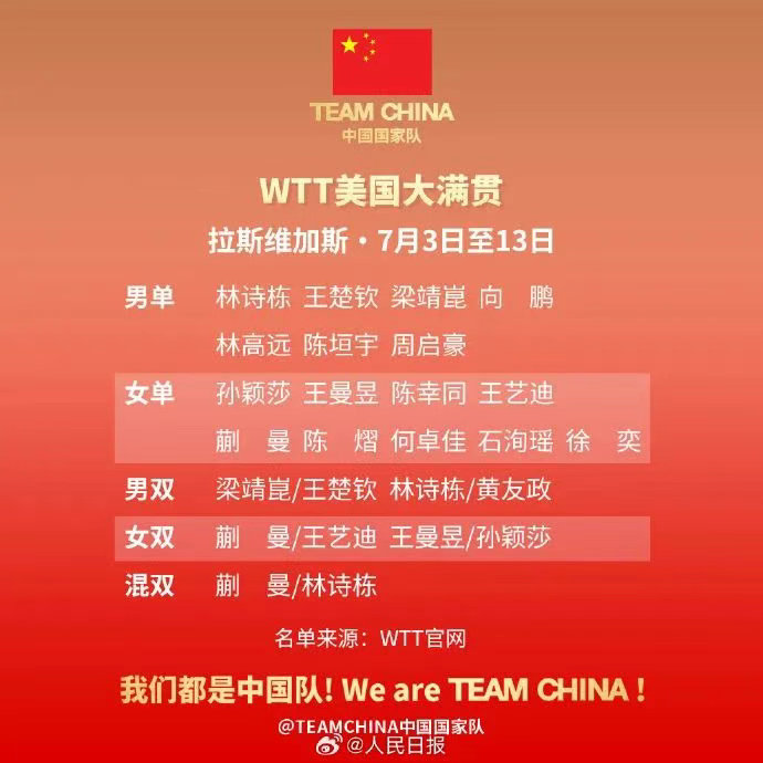 2025年WTT美国大满贯将于7月3日至13日举行,国乒出战名单已公布。